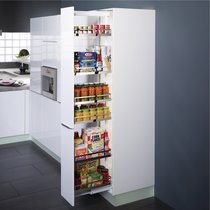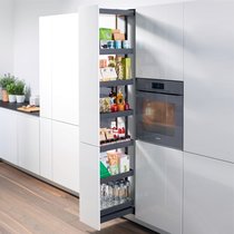 Wil je de ruimte in een hoge keukenkast optimaal benutten? Dan is de Kessebohmer Dispensa het perfecte systeem. De Kessebohmer Dispensa is een systeem voor apothekerskasten, die ideaal is voor hoge kasten van minimaal 900 mm en maximaal 2300 mm hoog. Doordat je de inhangkorven los kunt bestellen kun je zelf bepalen hoeveel opbergruimte je wilt creëren in de apothekerskast en personaliseer en optimaliseer je de ruimte naar aanleiding van de hoogte van de kast. De Kessebohmer Dispensa is in vier hoogtematen leverbaar: 900 tot 1300 mm, 1200 tot 1600 mm, 1600 tot 2000 mm en 1900 tot 2300 mm. Omdat je ook nog de benodigde breedtemaat voor jouw apothekerskast kunt aangeven bij het bestellen van de Kessebohmer Dispensa zal deze altijd mooi aansluiten bij de ruimte die je hebt. Let wel op; MeubelbeslagOnline levert enkel het systeem voor apothekerskasten. De keukenkast die hierbij hoort kan los worden besteld wanneer dit nodig is. Het Kessebohmer uittrekelement zorgt ervoor dat het draagframe gemakkelijk in hoogte te verstellen is. De montage van de Kessebohmer Dispensa is ook nog eens super eenvoudig. Zo monteer je de boven- en ondergeleiders snel met spaanplaatschroeven, waar je vervolgens het draagframe tussen kunt plaatsen. In het frame plaats je op de gewenste plekken de inhangkorven. Zowel de apothekerskastensystemen van Dispensa als de inhangkorven zijn verkrijgbaar in verschillende designs.