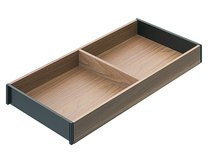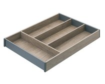 houten bestekbak in combinatie met de Blum Ambia-line lade indeling. De losse stalen frames en dwarsverdelers van Blum zorgen ervoor dat je de ruimte in jouw lade optimaal kunt benutten en jouw bestek en keukengerei overzichtelijk kunt opbergen. De Ambia-line serie is verkrijgbaar in verschillende kleuren, waaronder zwart, grijs en wit. Daarnaast zijn er ook Blum lade indelingen leverbaar in houtprints, zoals