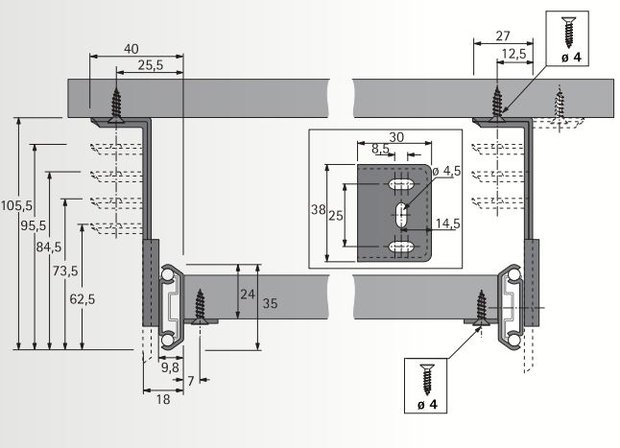 De Hettick KA 3434 ladegeleider is geschikt voor toetsenbordplateaus, schuiflades en uitschuifbare legplanken.