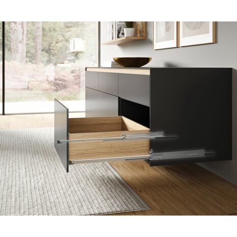 Bij deze Hettich Quadro V6 push to open 5D ladegeleider – 420 mm draait alles om gebruiksgemak. Je opent de lade simpel door het front licht in te drukken, waarna deze automatisch naar voren komt. Ideaal voor meubels waar je een strak front wilt behouden, zoals een greeploze keuken of moderne kast. Met een draagvermogen van 30 kg is deze ladegeleider geschikt voor lades die wat meer gewicht moeten dragen. Denk aan besteklades, voorraadlades of werkplaatsmeubels. De stalen constructie zorgt ervoor dat de lade stabiel blijft, ook wanneer je deze volledig uittrekt. Deze ladegeleider wordt onder de lade gemonteerd en is daardoor niet zichtbaar wanneer je de lade opent. Dat zorgt voor een strakke afwerking zonder zichtbare rails aan de zijkant. Ideaal als je een rustig en netjes meubel wilt behouden.