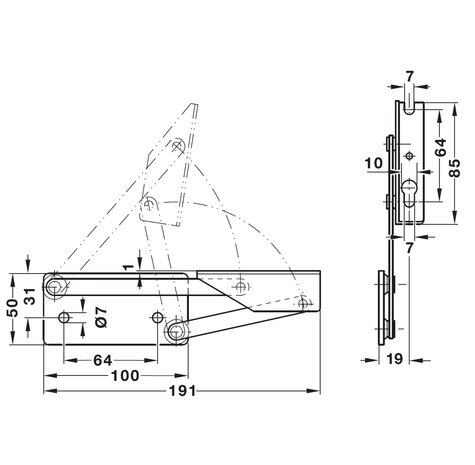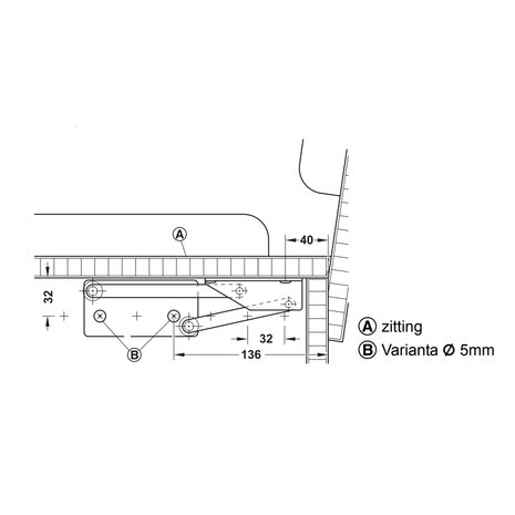 Dit hoekbankscharnier is geschikt voor het openen en ondersteunen van zittingen in banken of opbergmeubels. Het scharnier zorgt ervoor dat de zitting gecontroleerd omhoog gaat tot een hoek van 95 graden en in geopende stand blijft staan. Hierdoor heb je beide handen vrij bij het opbergen of pakken van spullen. De uitvoering is voorzien van een veer die als tegengewicht werkt. Dit maakt het openen lichter en zorgt ervoor dat de zitting niet onverwacht dichtvalt.
