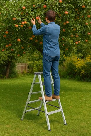 De aluminium trap is licht van gewicht, maar stevig in gebruik. Met een maximale draagkracht van 150 kg en een eigen gewicht van slechts 3,2 kg verplaats je hem moeiteloos waar je hem nodig hebt. Dankzij de antisliptreden en -voetjes sta je stabiel en wordt verschuiven effectief voorkomen. Na gebruik klap je de trap eenvoudig in tot een compacte lengte van ongeveer 81 cm, waardoor hij weinig ruimte inneemt bij het opbergen. Ideaal als je op zoek bent naar een betrouwbare huishoudtrap die nét dat beetje extra hoogte biedt voor klussen in en rondom huis.