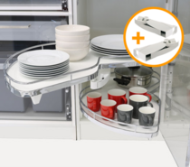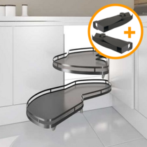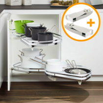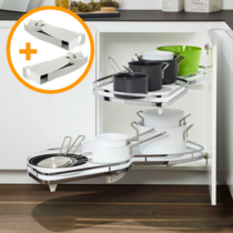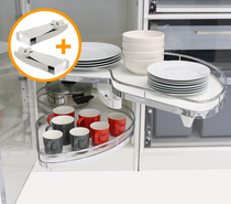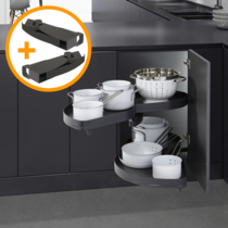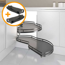 bestekbakken, apothekerskasten en andere keukenkastinrichting. Het is dus mogelijk om met de Kesseböhmer Le Mans een mooie eenheid te creëren met de rest van de keuken. Het Le Mans hoekkastsysteem wordt geleverd met twee plateaus. Na montage kun je deze plateaus met één handbeweging uit de kast draaien. Tijdens het sluiten wordt elk plateau opgevangen door de meegeleverde dempers. Deze geruisloze sluiting zorgt voor veel comfort en gebruiksgemak.