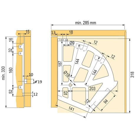Dit kiepbeslag is ideaal voor het creëren van een praktische en overzichtelijke schoenenkast met drie afzonderlijke vakken. Dankzij het slimme mechanisme kantelt het front naar voren, waardoor je eenvoudig toegang krijgt tot de schoenen in de kast. Het beslag is geschikt voor drie schoenenplanken met een dikte van 12 mm en hoogtes van 144, 144 en 94 mm. Voor een optimale werking stem je de breedte van de vakken af op de binnenmaat van de kast, waarbij je de vrije breedte met 8 mm vermindert.