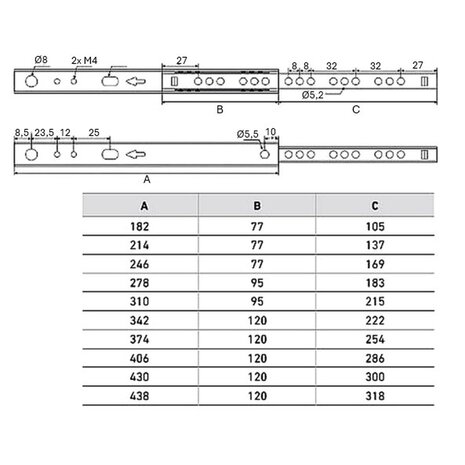 Deze gedeeltelijk uittrekbare kogelgeleider met exacte geleiding gaat soepel open en dicht en heeft een goede zijdelingse stabiliteit. De ladegeleider heeft een uittrekaanslag en is voorzien van uitlooppreventie. De uitlooppreventie voorkomt dat je de lade helemaal uit de kast trekt. Deze geleider bestaat uit twee delen waarvan een deel aan de kastzijde gemonteerd wordt en het andere deel aan de ladezijde. Beide delen hebben eenzelfde lengte van 182mm. Het draagvermogen is 10kg per set wat betekend dat deze geleiders met name geschikt zijn voor lichte toepassingen.