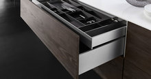 Blum Tandembox lade kenmerkt zich door de traditioneel afgeschuinde lade zijwanden. De hogere laden zijn voorzien van een extra rechthoekige reling. De Tandembox zelfbouwlade is leverbaar in de kleuren wit, grijs en zwart. Standaard is dit type keukenlade uitgevoerd met een softclose functie voor het geruisloos sluiten van de lade. Afhankelijk van de functie van de lade kan gekozen worden voor een laag of een hoog model. Voor een besteklade kun je bijvoorbeeld een M-lade gebruiken met een inbouwhoogte van 98,5 mm. Voor een voorraadlade of zware pannenlade kun je beter een D-lade gebruiken met een inbouwhoogte van 228 mm. Als je de Tandembox lade greeploos wilt kunnen openen is de Blum Tandembox Tip-on Blumotion lade een aanrader. Deze lade is greeploos te openen en zal bij het sluiten softclose (gedempt) dichtschuiven. Dit type lade noemen we ook wel een push to open lade. Voor het maken van een binnenlade leveren wij diverse frontsets, in dezelfde kleuren als de ladezijwanden.